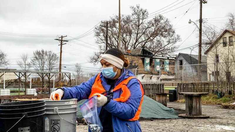 Volunteers working to collect used whippet containers in a Detroit neighborhood on March 26, 2022.