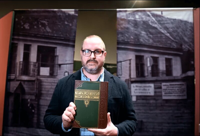 Exhibit curator Mark Mulder, of Grosse Pointe, in front of the entrance to the Vilna ghetto entrance to the exhibit as he holds the original 1929 book of Yiddish lexicon from Vilna, Tuesday afternoon, Jan. 18, 2022. Photo Credit: Todd McInturf, The Detroit News