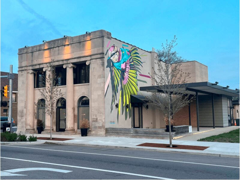 A former bank building in Detroit’s West Village neighborhood is being converted into a dog park with a bar.