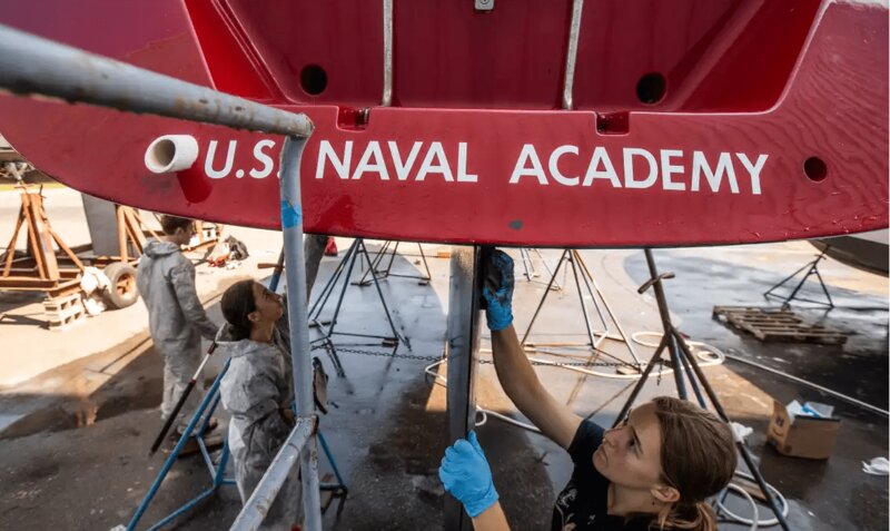 But this year, a group of six sailors and their varsity coach climbed into their white Ford Transit van at the U.S. Naval Academy in Annapolis, Maryland, and drove nine hours to Port Huron on July 9. There they met up with the Avenger, a J-105 sailboat that’s 34.5 feet long, sitting on stilts (called “jack stands”) in a shipyard. It had been trucked to Michigan.